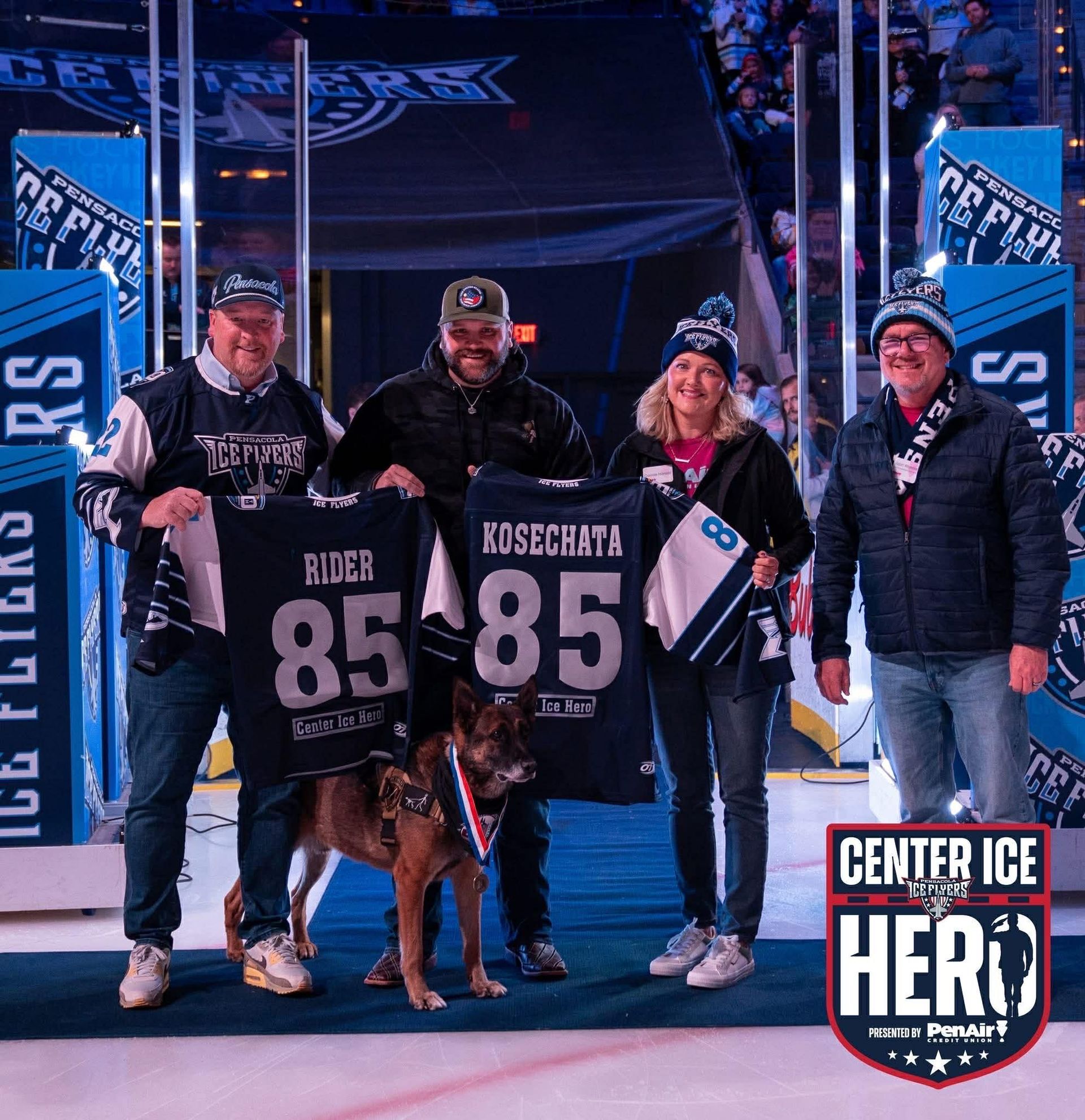 RMWD Rider was reppin’ for War Dogs and the K-9 community when he and his former handler and adoptive dad, Josh, were invited to enjoy the spotlight pre-game at the Pensacola Ice Breakers ice hockey game. They were invited out onto the ice before the game where Rider was acknowledged as Center Ice Hero. They spoke about Rider’s service and accomplishments and while Rider sported his US War Dogs MWD Service Medal, Josh was presented with a custom jersey each, from the team. Way to go, Rider!