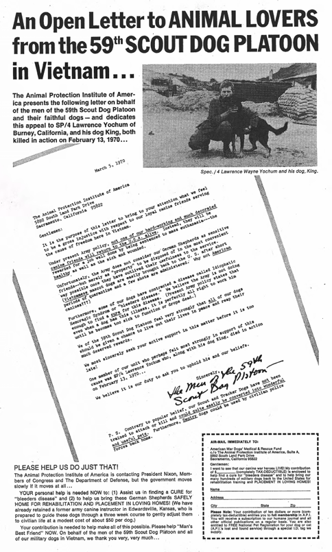 The letter penned by the 59th Scout Dog Platoon, which was published by The Animal Protection Institute of America