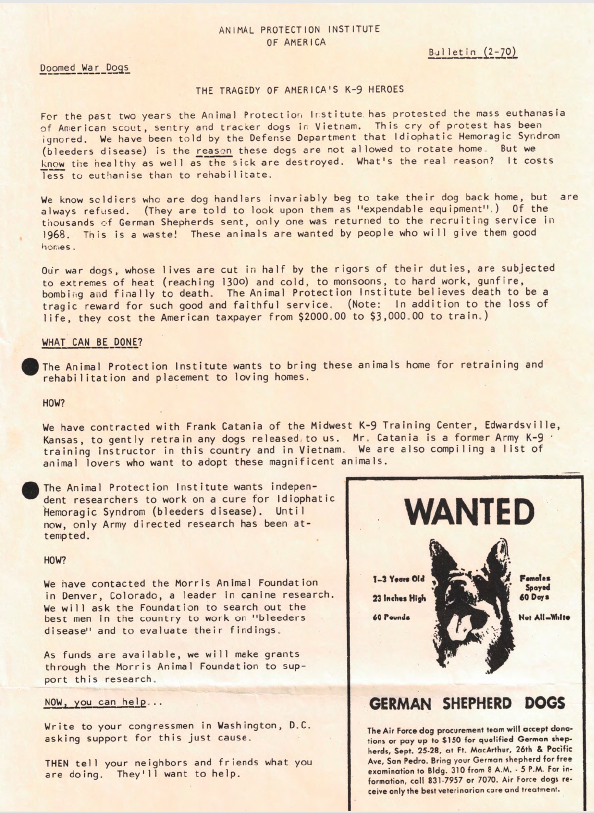 The platoon’s letter was printed by The Animal Protection Institute of America, to raise the profile and plight of the military dogs in Vietnam. The organization – and others like it – fought to raise profile of the injustices of America’s war dogs in the war, attempting to raise funds to bring the dogs home.