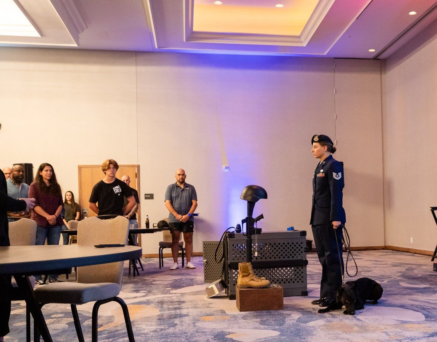 As a piper started playing Amazing Grace, four active-duty dog teams began their slow march and salute to a traditional K-9 memorial: An empty kennel, upturned water bowl and bible – all placed next to a pair of boots, a rifle and helmet. Each dog team formed up in the center of the auditorium while the audience stood in silent contemplation for those they had lost.